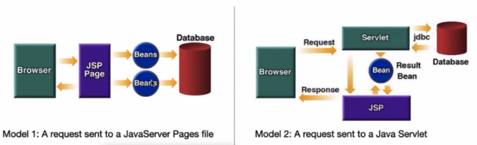 이런 JSP는 어떤 방식으로 사용하느냐에 따라 모델 1 구조와 모델 2 구조가 존재합니다. JSP를 통해 뷰의 구성과 비즈니스 로직의 처리까지 모두 수행한다면 모델 1 이라고 불렸고, 뷰의 구성만 담당한다면 모델 2라고 불렸습니다.