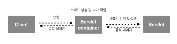 Servlet 방식의 웹 어플리케이션은 대개 Servlet Container를 가집니다. Servlet을 초기화해주고 호출하는 '누군가'가 필요하기 때문입니다. Servlet Container는 Servlet을 관리해주면서, 웹소켓 통신을 제공하는 등 동적 웹페이지를 제공하기 위한 기타 작업을 수행해줍니다.