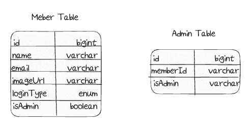 그렇다면 이런 Member 테이블을 활용해 어드민 기능을 구현할 수는 없을지 고민이 들었습니다. 컬럼을 하나 추가해(isAdmin과 같은) 어드민인지 식별할 수 있게 하거나 추가적인 매핑 테이블을 생성해 아래와 같이 어드민 여부를 판단할 수 있게 할 수 있을 것 같습니다.