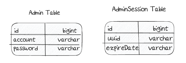 세션 기반의 인증을 구현하기 위해 스키마는 위와 같이 구성했습니다. Admin 테이블에는 실제 어드민 정보가 들어가며 AdminSession 테이블에는 로그인 시 생성되는 세션이 저장됩니다. PK가 유출되지 않도록 uuid 값을 통해 세션을 식별하도록 구성했습니다.