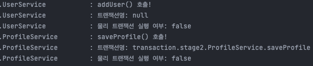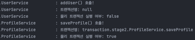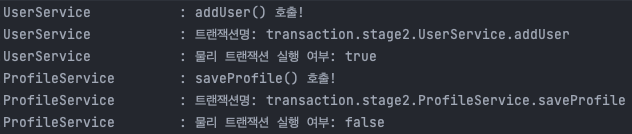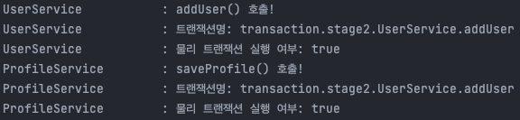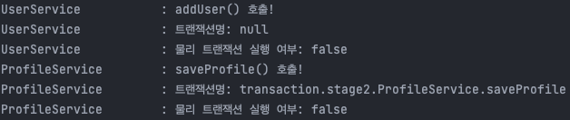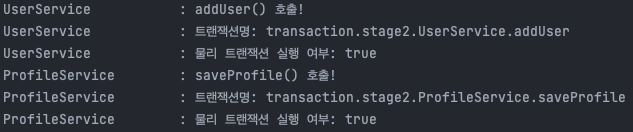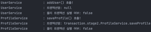 addUser의 @Transactional을 제거하는 경우에는 기존에 진행중이던 트랜잭션이 존재하지 않으므로, REQUIRED 속성에 따라 새로운 트랜잭션을 생성하게 됩니다. 로그를 보시면 아시다시피 UserService에서는 트랜잭션이 없고, ProfileService에서는 saveProfile 메소드를 기준으로 하나의 트랜잭션을 생성하게 됩니다.