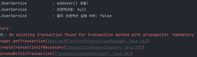 여기서 참여한다는 의미는 트랜잭션을 그대로 이어간다는 말과 동일합니다. UserService의 addUser를 실행했을 때 나오는 로그는 다음과 같습니다. 기존에 이미 진행 중이던 논리 트랜잭션(addUser)이 있으므로 참여하게 되고 새로운 트랜잭션을 생성하지는 않습니다.