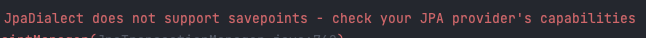 메일을 보내는 로직이 실패했다고 해서 회원가입까지 롤백되기를 원하지 않는 경우 등에서 NESTED를 사용할 수 있습니다. 하지만 이 기능은 JDBC의 savepoint 기능을 사용하기 때문에 JPA 등에서는 사용이 불가능합니다. 만약 실행하게 되면 아래와 같은 오류가 뜹니다.