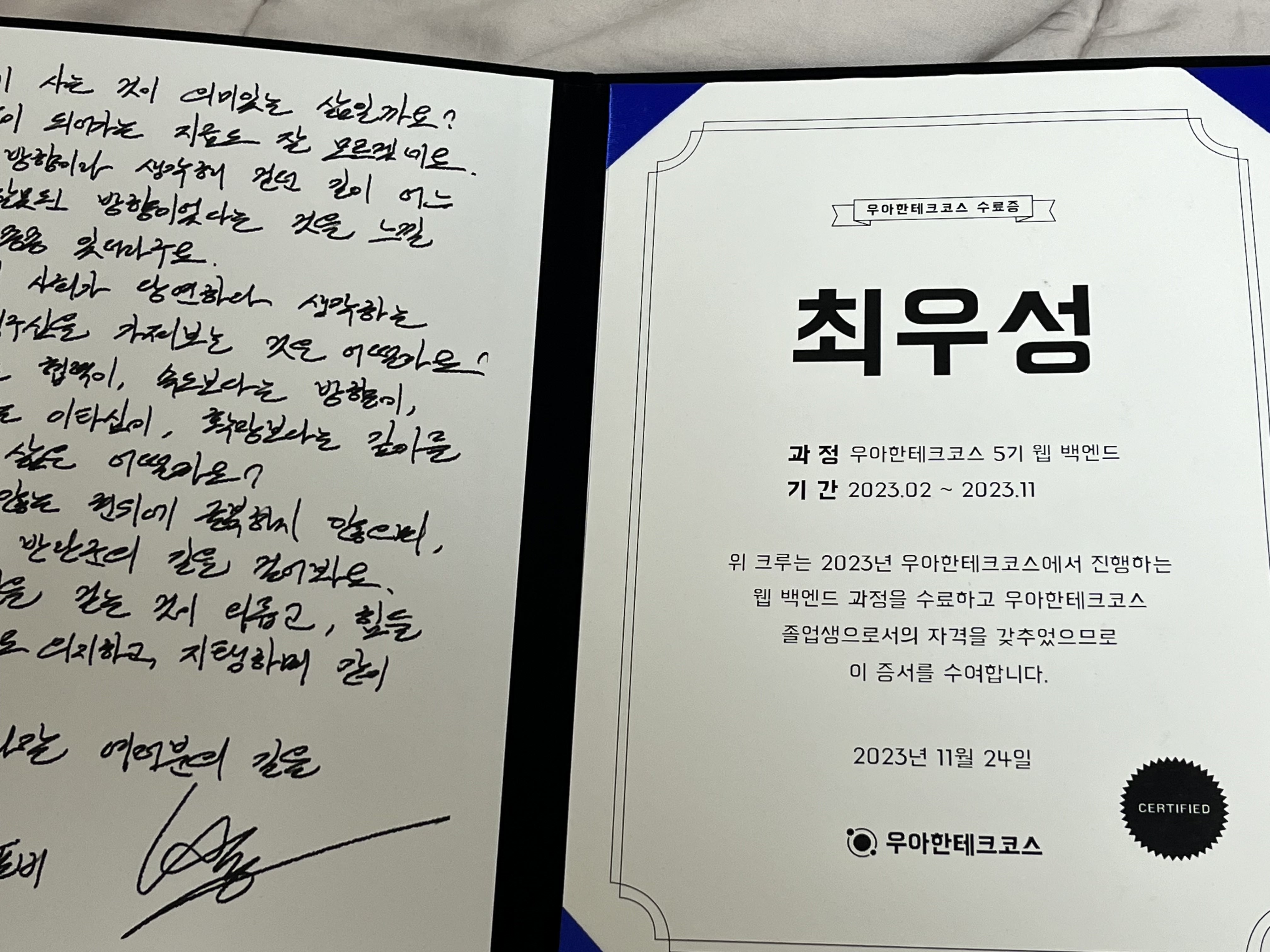 우아한테크코스 과정이 종료되었다! 벌써 시간이 이렇게 빠르게 흐르다니..🥲 약 10개월간의 여정이 처음에는 길게 느껴졌었는데, 지금 와서 돌이켜보니 그렇게 길지만은 않았던 것 같기도 하다. 이 과정에서 많은 것들을 느꼈고, 배웠고, 성장했다. 단순히 기술적인 성장을 넘어서서 인격적인 성장, 그리고 내 삶에 대해 고민을 많이 했던 계기였다. 그리고 부족했던 점들에 대해서도 느끼는 순간이 많았다. 우아한테크코스의 마지막 회고라는 사실이 아쉽기는 하지만, 담백하게 지난 1년을 되돌아보려고 한다! ㅎㅎ