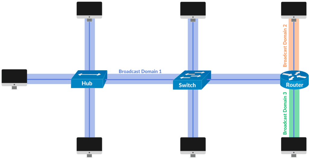 우선 브로드캐스트란, 하나의 네트워크에 속한 모든 디바이스에게 메세지를 전송하는 것을 의미한다. 비슷하게, 브로드캐스트 도메인은 '브로드캐스트 패킷으로 영향을 받는 네트워크 영역'을 의미한다.