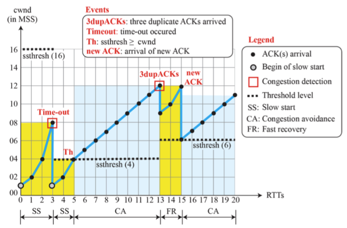벌써 눈치 챈 분도 있겠지만, Tahoe의 경우 ssthresh를 '혼잡이 발생한 cwnd 크기의 절반' 으로 설정한다. Time-out이 발생했던 지점은 cwnd가 8일 때이므로, 이후 ssthresh는 절반인 4로 설정된다. Duplicate ACK가 발생하는 순간에는 cwnd가 12이므로, 6으로 설정되는 것을 알 수 있다.
