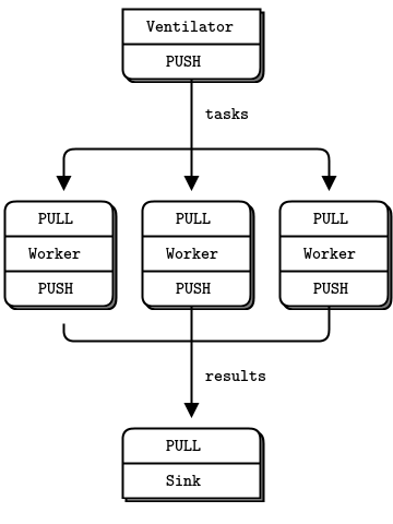 Pipeline, which connects nodes in a fan-out/fan-in pattern that can have multiple steps and loops. This is a parallel task distribution and collection pattern. - ZMQ Reference