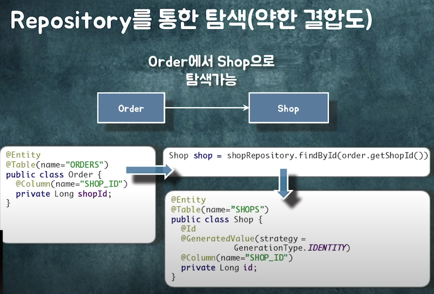 굳이 참조를 쓰지 않더라도 Repository를 통해 탐색 가능한 애들은 쓰지 않는게 좋다.