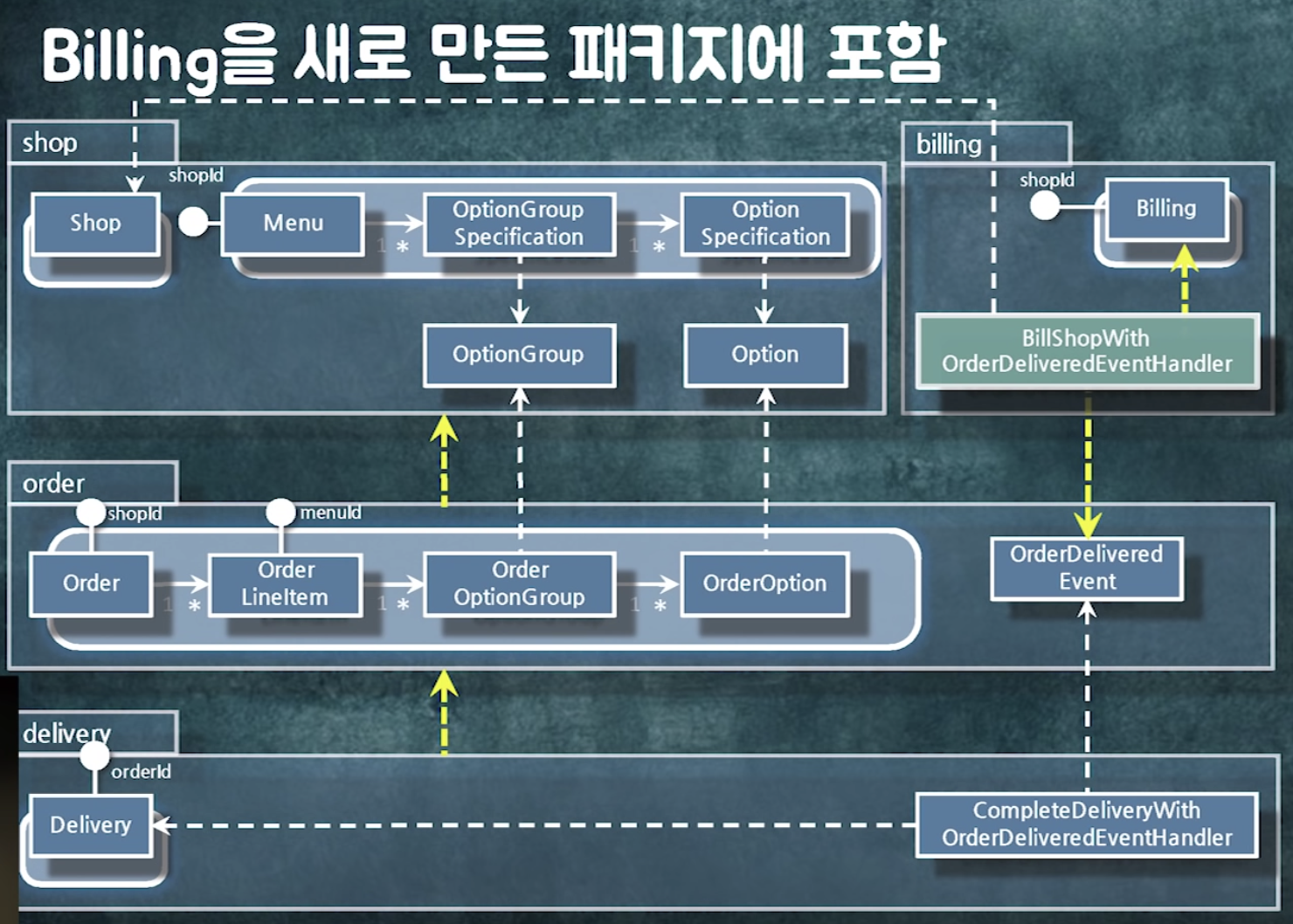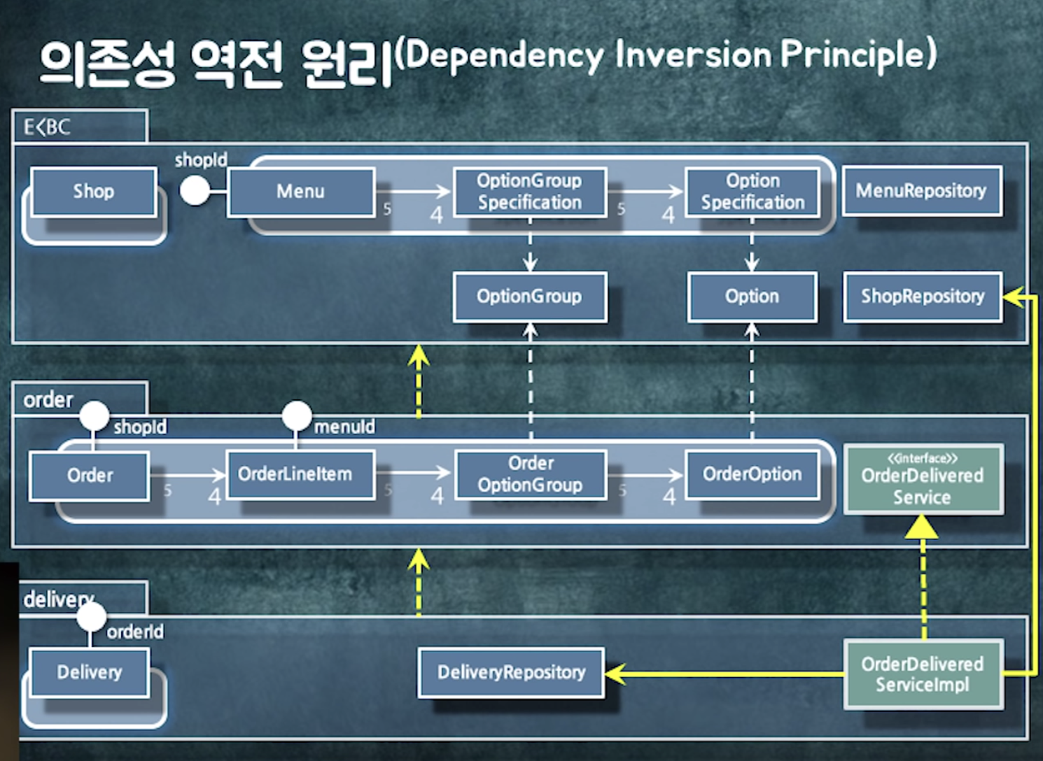 인터페이스는 order 쪽에, 그것을 실제로 실행하는 쪽은 delivery 쪽에 있음.