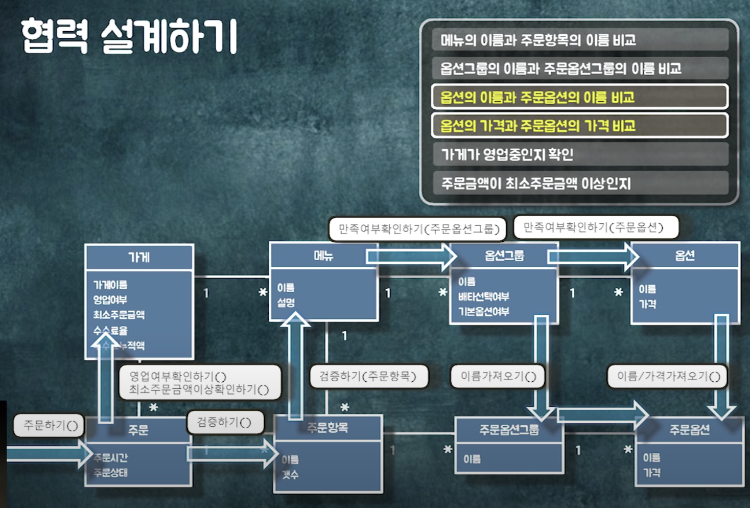 아래는 이런 연관관계, 의존관계를 이용해 실제 코드 레벨에서의 객체 협력을 구성한 모습이다.