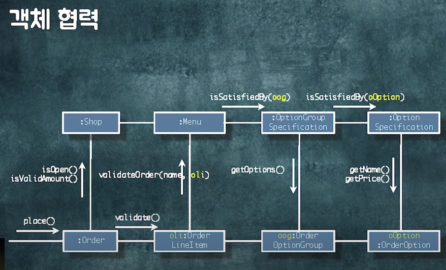 아래는 이런 연관관계, 의존관계를 이용해 실제 코드 레벨에서의 객체 협력을 구성한 모습이다.