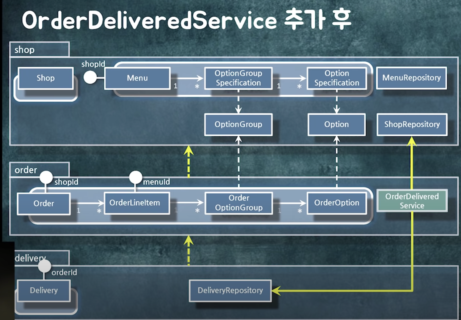인터페이스는 order 쪽에, 그것을 실제로 실행하는 쪽은 delivery 쪽에 있음.