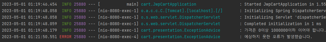 - Warn: 로직 상 유효성 확인, 예상 가능한 문제로 인한 예외 처리, 당장 서비스 운영에는 영향이 없지만 주의해야 할 부분
