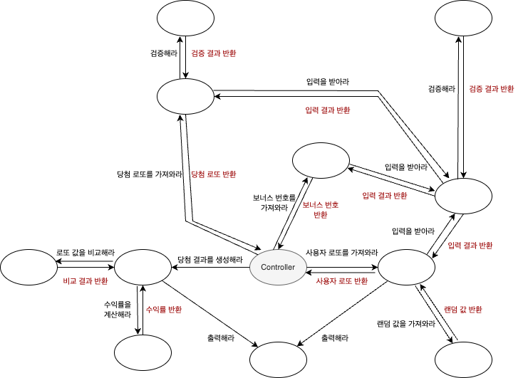 바로 3주차 미션 설계에 이를 적용했다. 나는 2주차 미션까지 시스템을 설계할 때 클래스 다이어그램을 구상했다. 이는 너무 클래스 중심이었다. 따라서 이번 미션부터는 메세지 다이어그램을 구상했다. 실제 내가 만든 메세지 다이어그램은 아래와 같다.