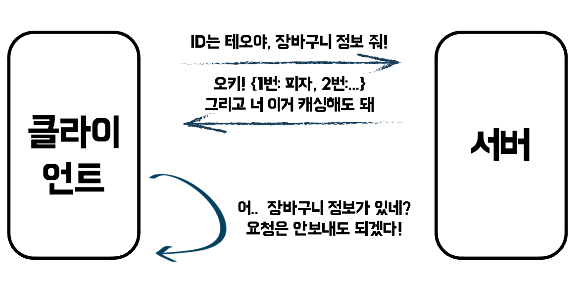 클라이언트가 장바구니 정보를 달라고 요청을 보냈다고 가정해보겠습니다. 그리고 서버는 정상 응답을 하는데, 이게 캐시 가능하다! 라고 마킹을 해줍니다. 그러면 동일한 요청을 일정 시간 내에 보내려고 할 때, 클라이언트는 요청을 생략하고 캐시된 자원을 사용할 수 있게 됩니다.