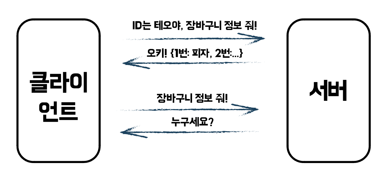 그러면 서버는 정상적으로 응답을 할 것입니다. 하지만 몇분 뒤, 클라이언트가 ID 정보 없이 장바구니 정보를 달라고 메세지를 보낸다면 서버는 '누구세요?'라고 응답을 합니다.