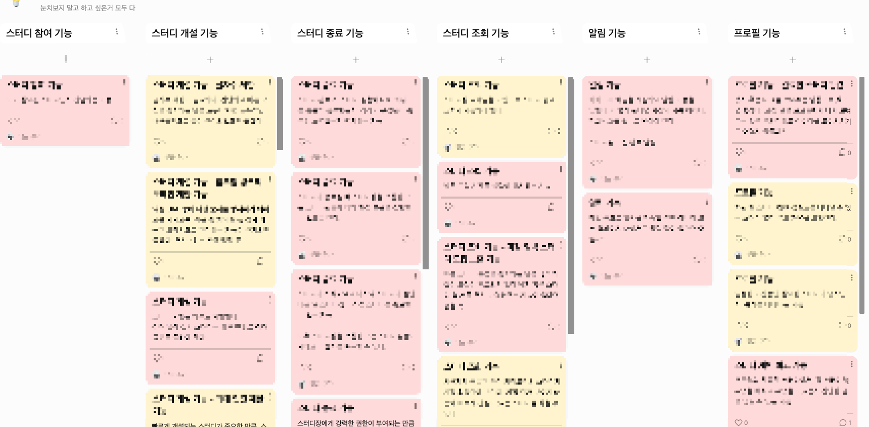 그 중 우선도가 높은 기능, 우선도가 낮은 기능까지 색깔로 분류했습니다. 이렇게 분류해놓고 보니 하루스터디의 방향성을 얼추 잡을 수 있었던 것 같습니다. 그리고 데모데이가 다음주 금요일까지라 무엇을 MVP로 설정해야 할지에 대해서도 많이 고민했던 것 같습니다.
