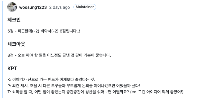 팀원들은 모두 동의해줬고, 당일(수요일)부터 체크아웃 시 KPT 회고를 진행하게 되었습니다! 또한, 이전 날의 회고를 통해 데일리 미팅때 action item을 선정해 실천하는 제도까지 도입했습니다.