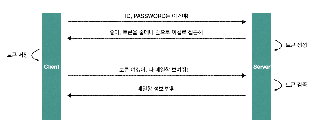 세션 방식의 flow와 크게 다르지 않습니다. 다른 점은 이번에는 인증 정보를 클라이언트가 직접 들고 있다는 점이죠. 클라이언트는 가지고 있는 토큰을 헤더에 실어서 보내면, 서버가 이를 검증하면서 토큰에 존재하는 인증 정보를 활용해 메일함 정보 반환 작업을 처리하게 됩니다.