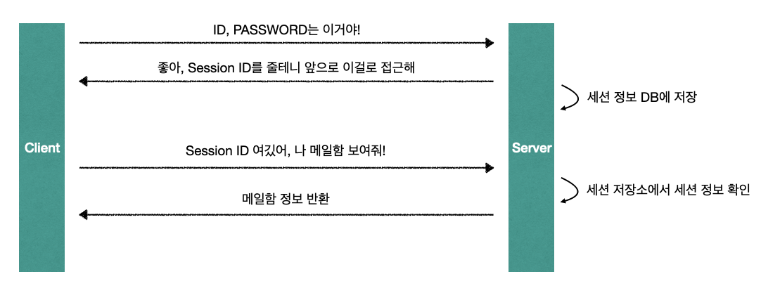 세션 기반의 인증 방식에 대해 먼저 설명하겠습니다. 이는 인증을 구현하기 위해 전통적으로 사용되던 방법 중 하나입니다. 여기서는 예시를 통해 설명해보겠습니다. 클라이언트가 메일함 기능을 사용한다고 가정해볼게요.