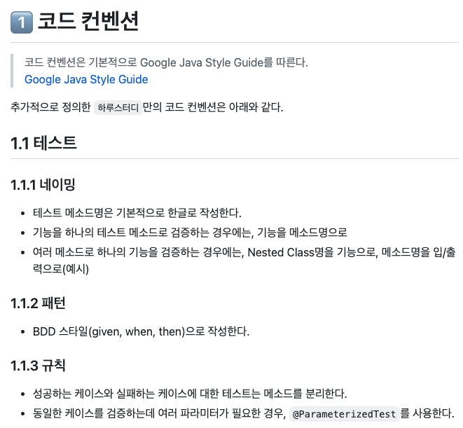 그리고 코드 컨벤션도 작성했습니다. 코드 컨벤션의 경우 처음부터 끝까지 일일히 정의하기에는 너무 양이 방대하다는 생각이 들어서, 일단 생각나는대로 작성해두고 나중에 추가하기로 했습니다. 페어 프로그래밍, 코드 리뷰 과정을 거쳐 아무래도 계속 구체화될 것 같긴 합니다.
