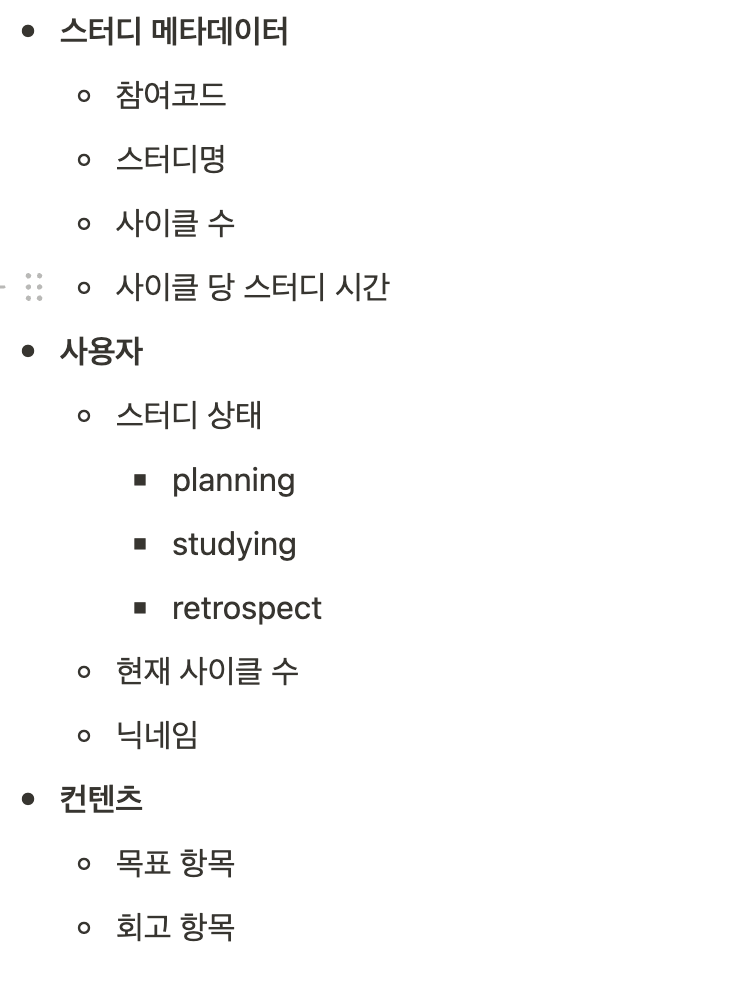 이렇게 도출된 키워드(데이터)들을 기반으로 ERD를 설계하기 시작했는데요, 처음에는 단순히 연관된 데이터라면 하나의 테이블에 묶었습니다. 예를 들어서 사용자와 관련된 정보(스터디 상태, 현재 사이클 수, 닉네임)이라면 모두 하나의 테이블로 설계했습니다.