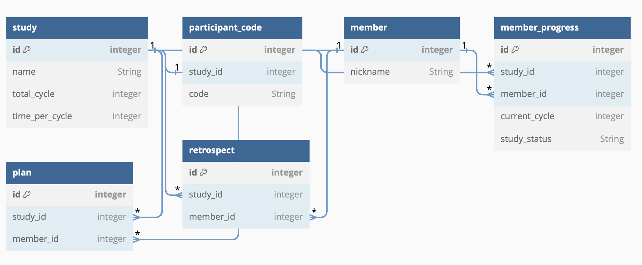 비즈니스적으로 변경될 수 있는 지점들을 고려했기 때문에 위 구조를 차용하면 추후 확장에 쉽게 대응할 수 있습니다. 스터디 템플릿 종류가 추가되어도 단순히 study의 PK를 외래키 참조하는 테이블만 하나 만들면 됩니다.