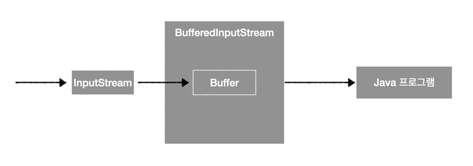 사용법의 측면에서 앞선 예시와 크게 다른 점은 없지만 BufferedInputStream이라는 보조 스트림을 통해 FileInputStream이라는 기반 스트림을 감싸고 있다는 점이 다릅니다.