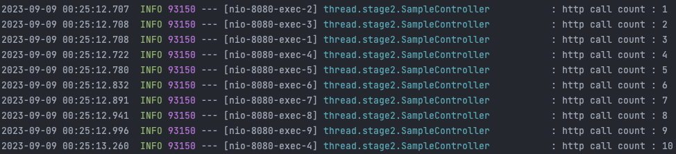 스레드 번호를 보시면 1번부터 9번까지, 9개 모두 비슷한 시간 내에 사용되고 있습니다. 이를 통해 maxConnections 값이 maxThreads보다 컸을 때 비로소 유휴 스레드가 없이 모든 스레드가 사용된다는 것을 알 수 있었습니다.