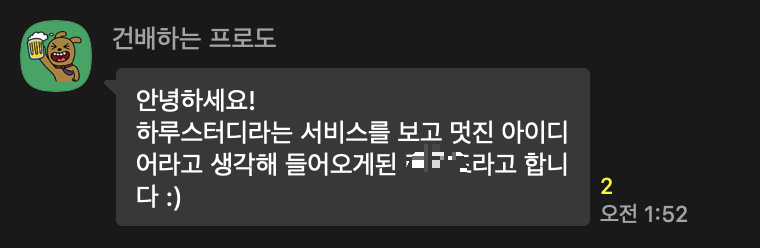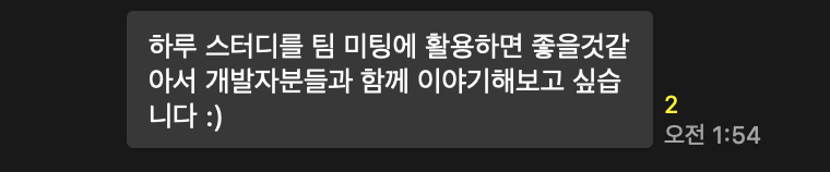 효율적인 학습 방법에 대해 관심이 많은 분이셨는데, 본인이 주관하는 교육 프로그램에서 팀 미팅용으로 하루스터디를 활용하고 싶다고 말씀을 주셨습니다. 설레발일 수도 있지만 외부 서비스와의 통합은 상상도 못했던 일이라 팀원들 모두 정말 놀랐습니다. 현재는 코치님들의 승인을 기다리고 있는 상태인데, 좋은 결과가 있었으면 좋겠습니다~!