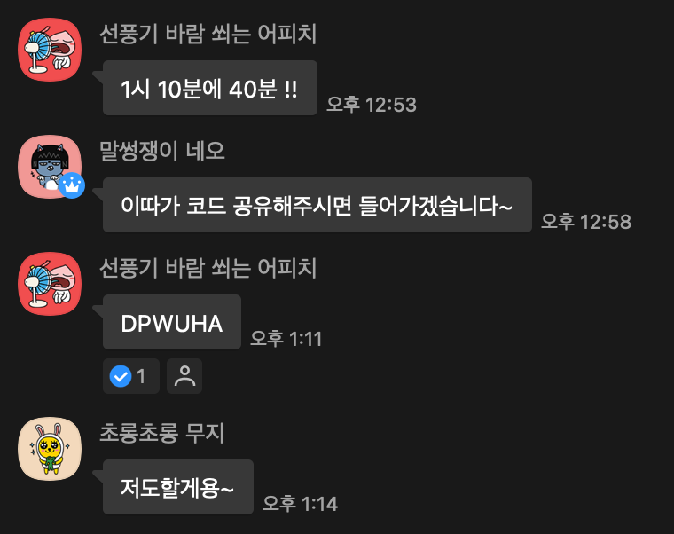 그 중 기억에 남는 분이 한 분 있는데, 그 분은 처음에는 저희 팀원들이 올리는 참여 코드를 통해 스터디에 참여하다가 나중에는 먼저 스터디를 하자고 하셨습니다. 이렇게 적극적으로 하루스터디를 사용하고자 하는 실사용자는 처음이어서 되게 기뻤습니다 😄 현재는 팀원들을 제외하고 8분정도 오픈카톡방에 계시는데, 앞으로도 많이 늘어났으면 좋겠습니다..!