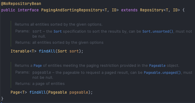 Spring Data JPA를 사용하는 경우에는 위 Pageable 인터페이스를 그대로 JpaRepository의 인자로 사용할 수 있습니다. JpaRepository가 인터페이스 상속을 하고 있는 PagingAndSortingRepository에 접근해보면, 페이징 기반의 findAll 메소드를 제공하고 있는 것을 확인할 수 있습니다.