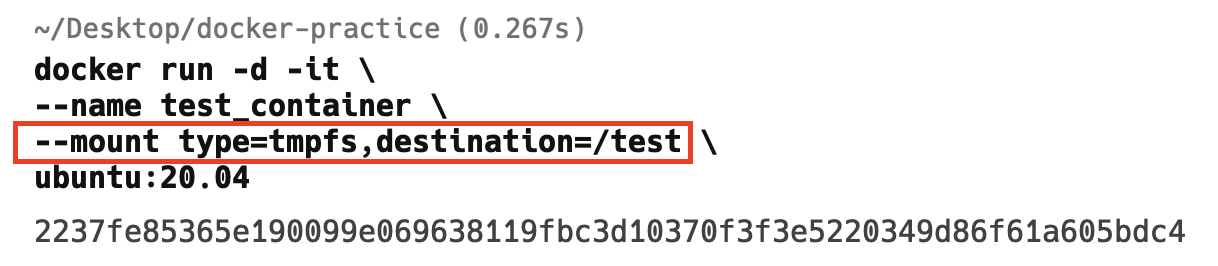 마찬가지로 실습을 통해 이해해봅시다. bind mount 방식과 유사하게 컨테이너를 기동합니다. 다만 type=tmfps로 설정하고 destination이라는 필드를 설정한다는 점에서 다릅니다.