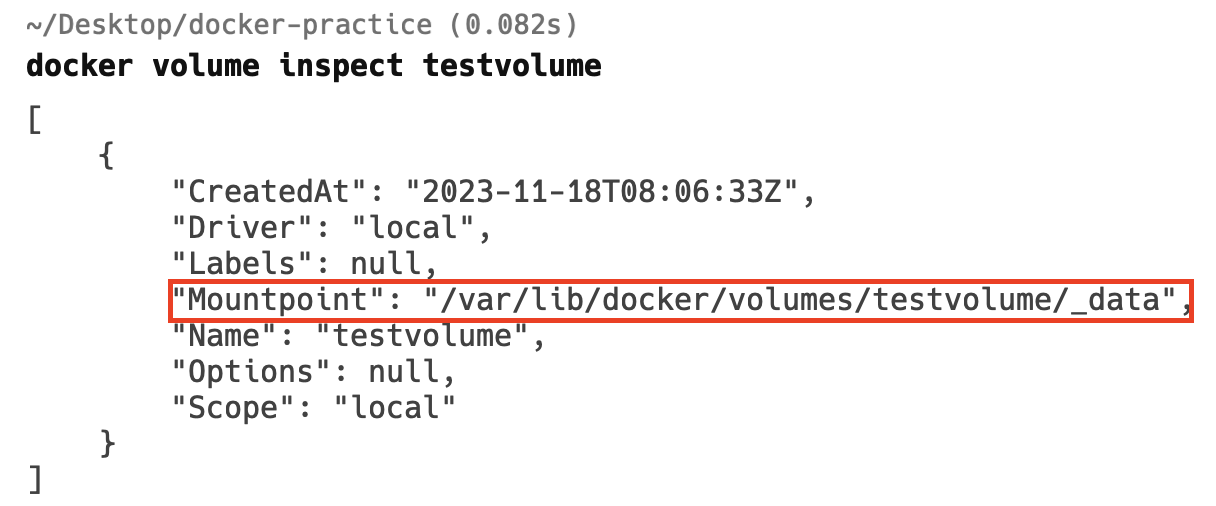 그리고 docke volume inspect 명령어를 통해 도커 볼륨의 정보를 확인해봅시다. MountPoint를 보시면 앞서 설명드렸다시피 지정된 경로에 생성되는 것을 확인할 수 있습니다. 참고로 볼륨명을 지정하지 않는 경우 도커에서 고유한 이름으로 디렉토리를 생성해주는데, 이를 익명 볼륨이라고 합니다.