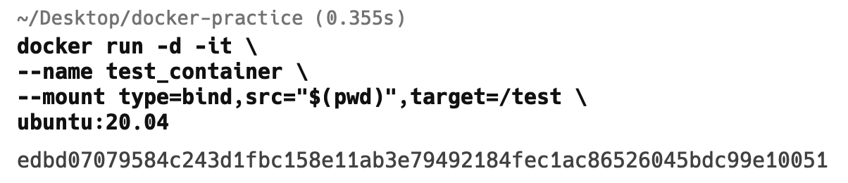 앞선 도커 볼륨 생성 방식과 유사하지만 --mount 옵션 부분이 다릅니다. bind 타입으로 설정하고 src 디렉토리와 target 디렉토리를 설정합니다. 위 예시에서는 현재 작업 경로(pwd)를 컨테이너의 /test 디렉토리에 마운트하겠다는 의미입니다.