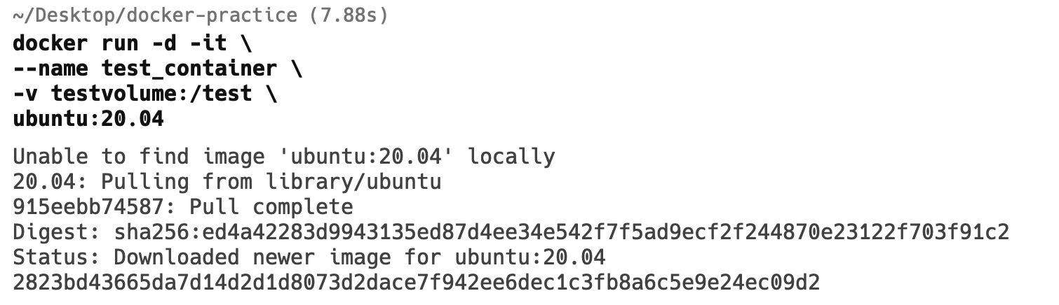 이제 다음의 명령어를 통해 실제 컨테이너에 볼륨을 마운트합니다. 베이스 이미지로는 ubuntu를 선택하겠습니다. -v 옵션 혹은 --volume 옵션을 통해 볼륨을 컨테이너에 연결해줍니다. 아래 예시에서는 testvolume을 컨테이너의 /test 디렉토리에 연결하겠다는 의미입니다.