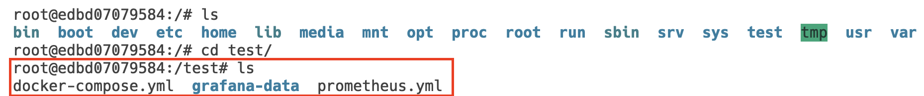 이후 컨테이너에 접속해 /test 디렉토리를 확인해보면 실제 호스트 머신의 디렉토리에 존재하는 파일들이 같이 드러나는 것을 확인할 수 있습니다. 참고로 docker-compose.yml, grafana-data, prometheus.yml 등은 제가 연습용으로 미리 만들어두었던 파일입니다.