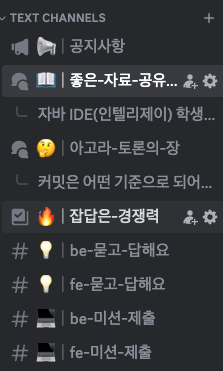 우테코 6기부터는 디스코드를 통해 커뮤니티를 운영한다. 그리고 해당 아이디어가 상당히 좋다는 생각이 들어 따라하게 되었다. 사실 미션이든, 커뮤니티든 대부분 우테코에서 따오긴 했지만, 아직 학생 신분인 내가 할 수 있는 일은 '우테코에서 배운 것을 그대로 공유하는 것'이라고 생각했다. 사실 그것만 해도 충분하다고 생각한다. 기타 변형을 부여하는 건 피드백을 받고 난 뒤라고 생각했다.