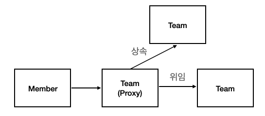 영속성 컨텍스트는 지연 로딩도 가능하게 합니다. 지연 로딩이란, 어떤 엔티티가 참조하고 있는 엔티티를 필요할 때 로딩하는 것을 의미합니다. 이런 지연 로딩이 가능한 이유는 JPA가 프록시 디자인 패턴을 사용하기 때문입니다. 만약 Member가 Team을 참조하고 있고, 지연 로딩을 적용했다면 아래와 같은 그림이 됩니다.