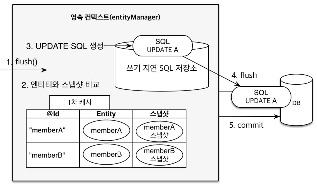 트랜잭션이 커밋되거나 flush가 호출되면 엔티티와 스냅샷을 비교해 변경된 엔티티를 찾고, UPDATE 쿼리를 생성해 쓰기 지연 SQL 저장소에 저장합니다. 그리고 이를 실제 데이터베이스에 반영합니다.
