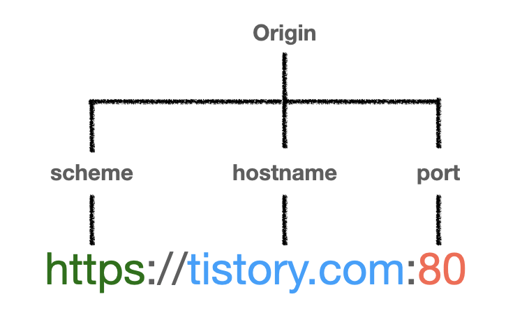 웹에서의 Origin이란 URL에서 scheme, hostname, port를 합친 부분을 의미합니다. Origin이 같다는 의미는 이 세 가지 부분이 모두 같다는 의미와 동일합니다. 예를 들어, 티스토리 블로그의 Origin은 다음과 같이 구성됩니다.