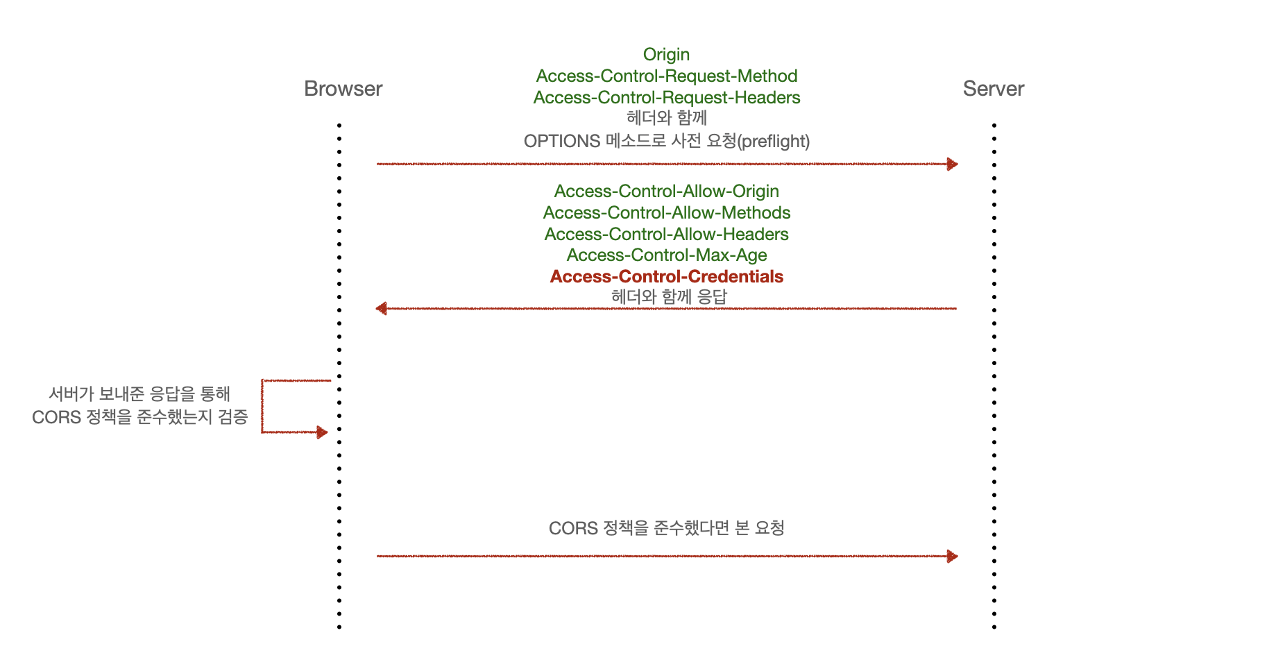 preflight request 방식과 상당히 유사하지만, 자격 증명(credential)에 대한 검증 기능이 하나 더 추가되었다고 생각하시면 됩니다. 서버는 요청에 대해 응답할 때, 자격 증명을 같이 전송해도 되는지에 대한 헤더(Access-Control-Credentials)를 true or false로 보냅니다.
