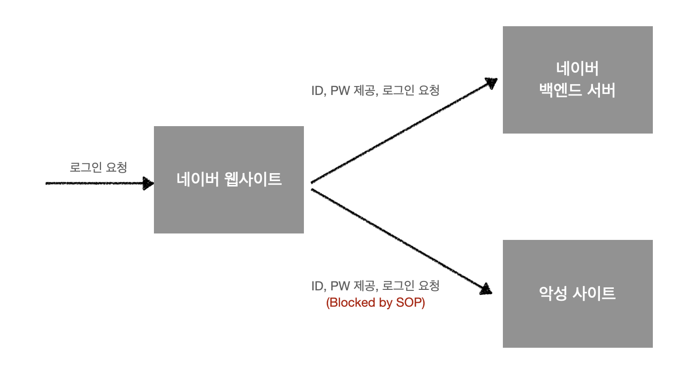 만약 SOP가 없다면 네이버에 접속한 유저는 로그인을 하든, 메일을 보내든 이 요청이 '네이버 서버'로 안전하게 전달될 것이라는 확신을 가질 수 없습니다. 웹사이트끼리 자유롭게 소통을 할 수 있는 환경이라면 네이버가 아닌 어떤 악성 사이트로 요청이 보내질 수도 있는 것이죠.
